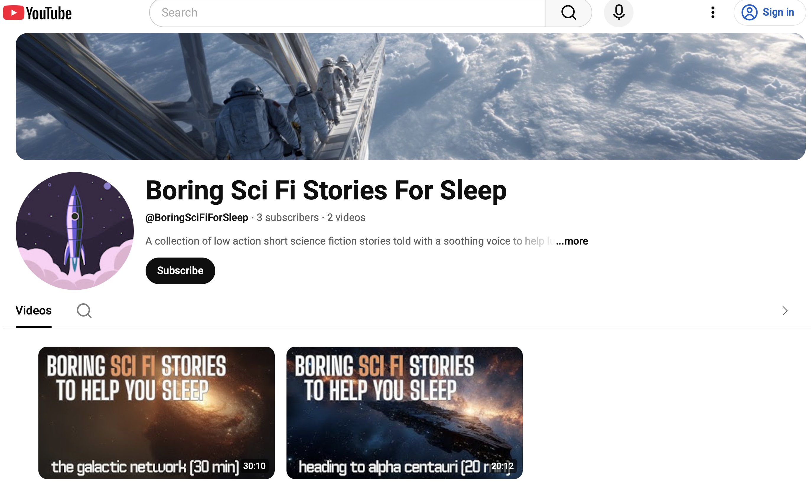 Currently, I'm also running a fun experiment using AI called Boring Sci Fi Stories For Sleep, which you can check out on YouTube here. I'm trying to test how quickly I can create new and (somewhat) entertaining science fiction stories narrated with a pleasing AI voice to lull you to sleep. I also plan on releasing them as an anthology in book form, which I'll be narrating myself.