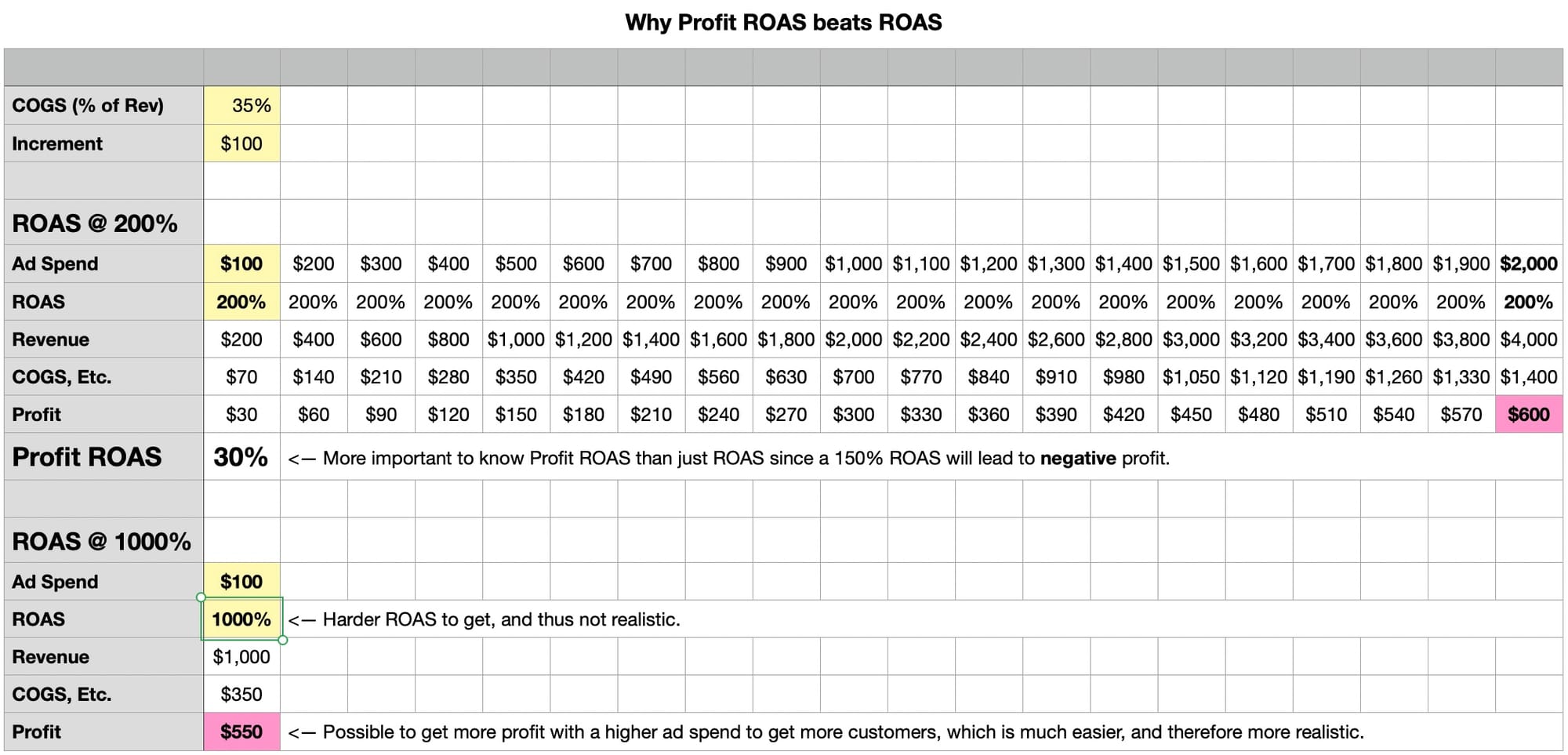 Thus, while ROAS is a useful metric, the more important metric is Profit ROAS: assuming COGS are 40% of sales, then $200 x 40% is $80, and profits would be $20 ($200 revenue - $100 ad spend - $80 COGS = $20 profit).